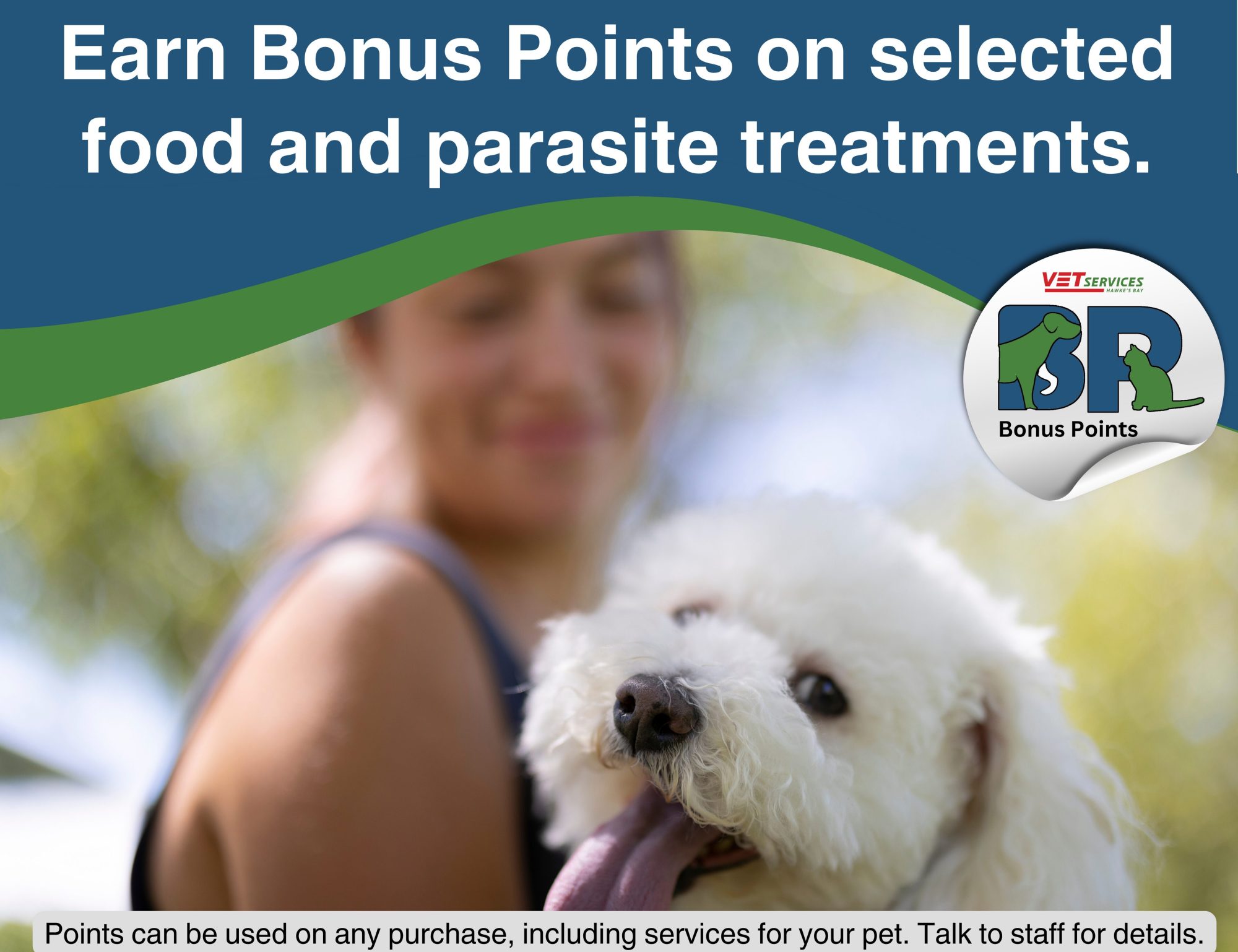 Vet Services Bonus Points is a loyalty programme that rewards our clients for selected animal health and food purchases. Look for the Bonus Point sticker on products in store or talk to staff for details.