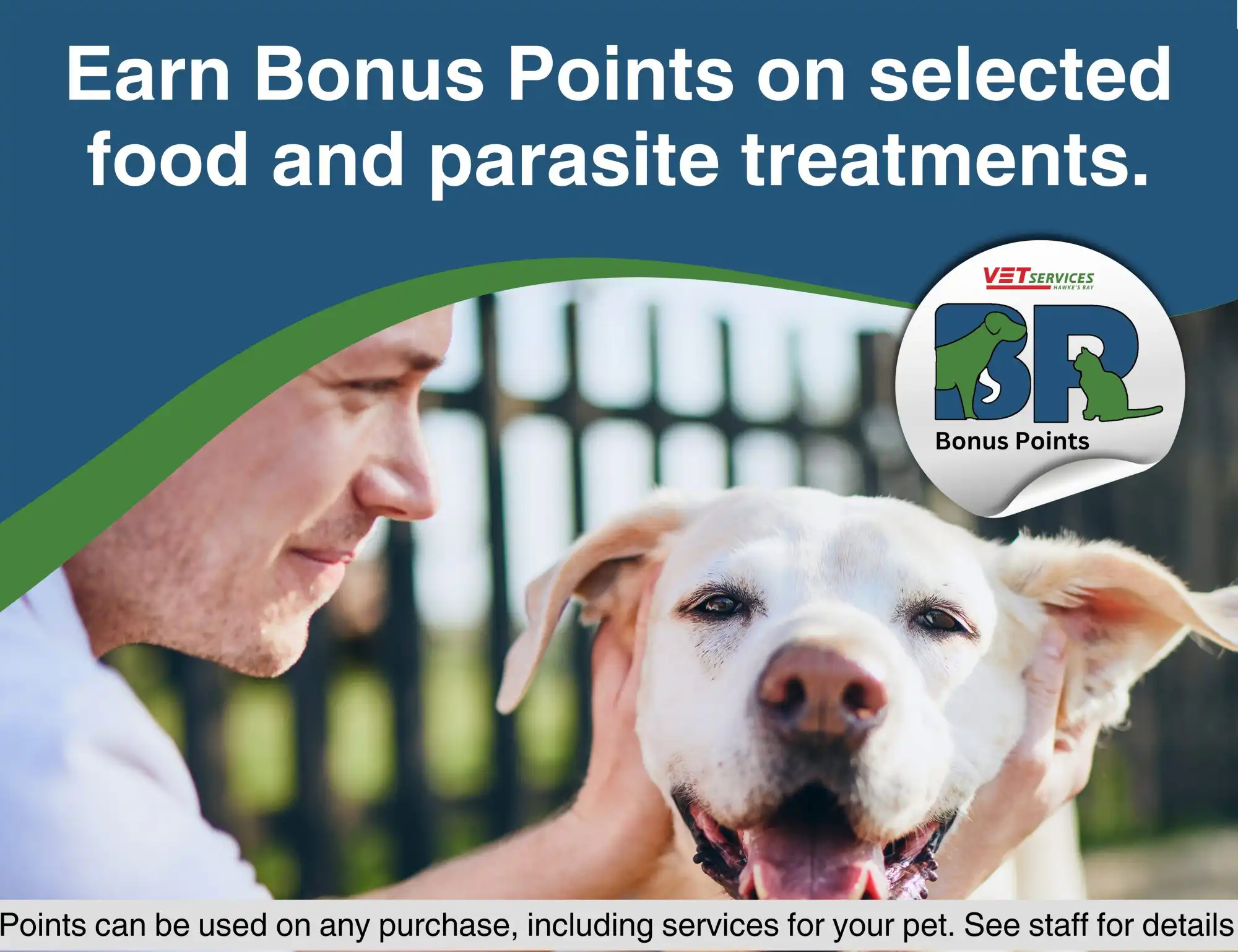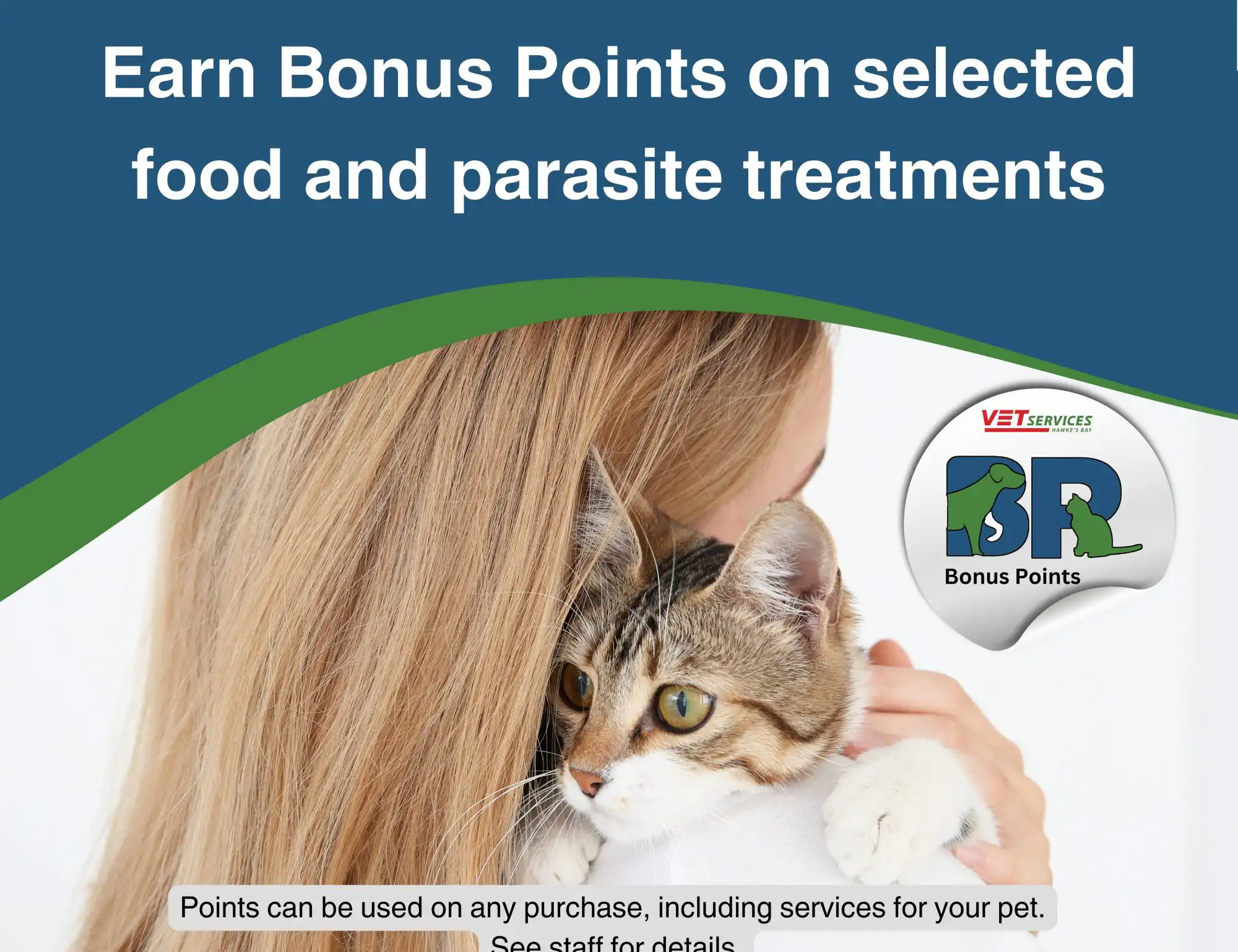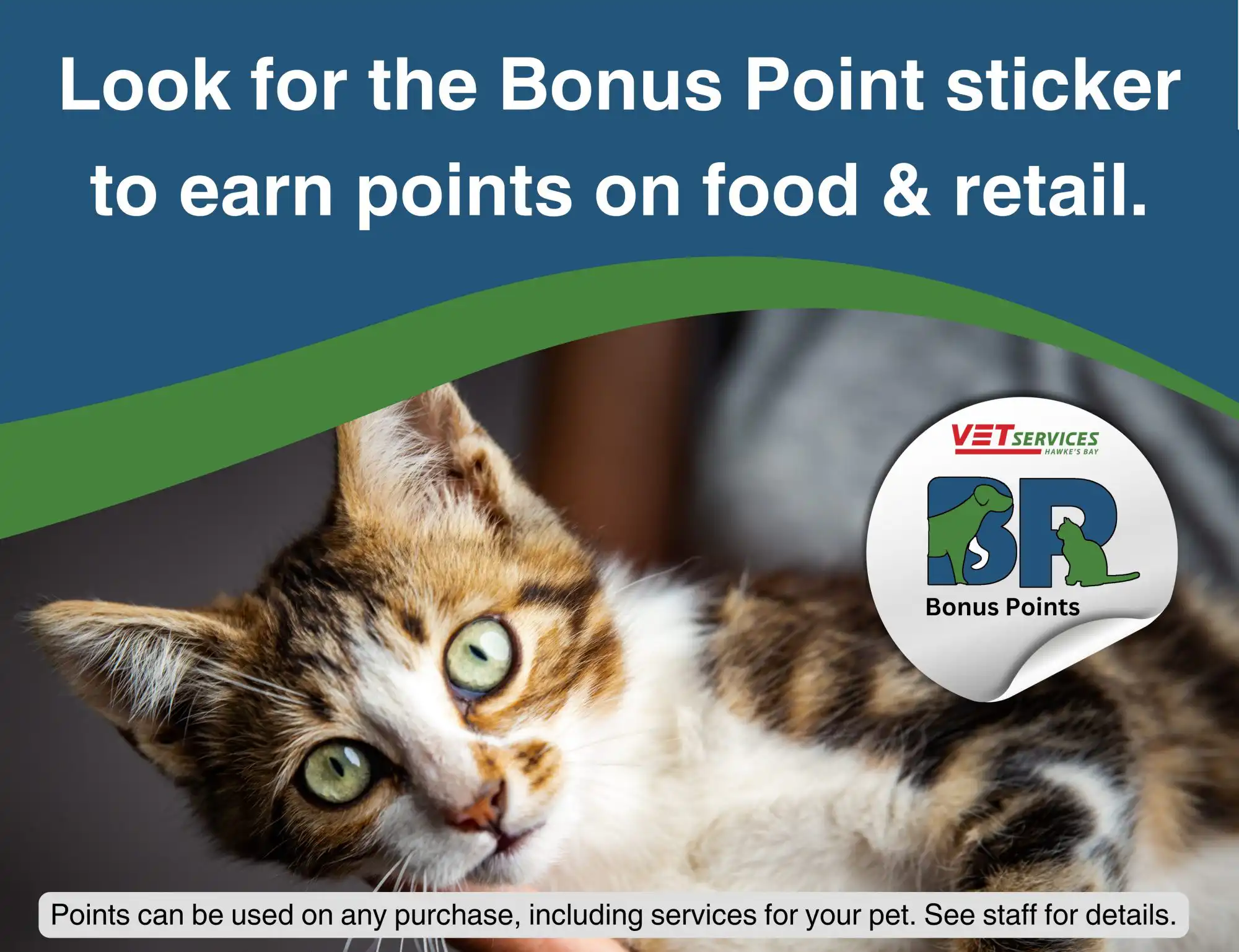 Vet Services Bonus Points is a loyalty programme that rewards our clients for selected animal health and food purchases. Look for the Bonus Point sticker on products in store or talk to staff for details.