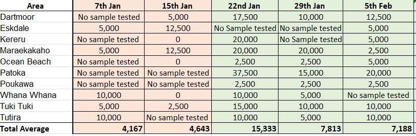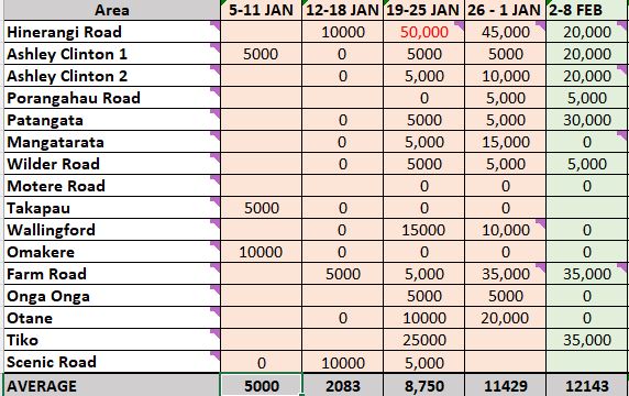 We have a new spot to watch in the region this week with Smedley Road having a spore count of 35,000 epg. Most other areas remain low, Ashley Clinton Road and Makaretu Road were next highest at 20,000 epg, with the other areas 5,000 epg or less.